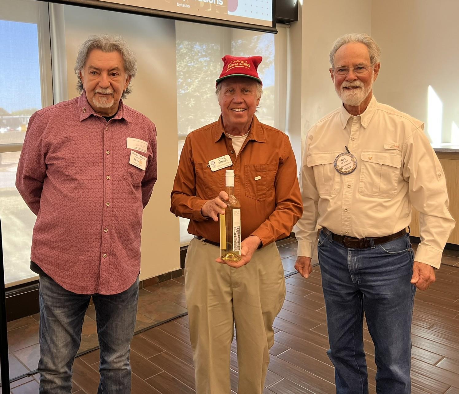 Wine is FineDave Samuel was wearing his Rotary pin when his name was called, so he won a bottle of wine, presented by Bill Tucker and Gabriel Alonso. |