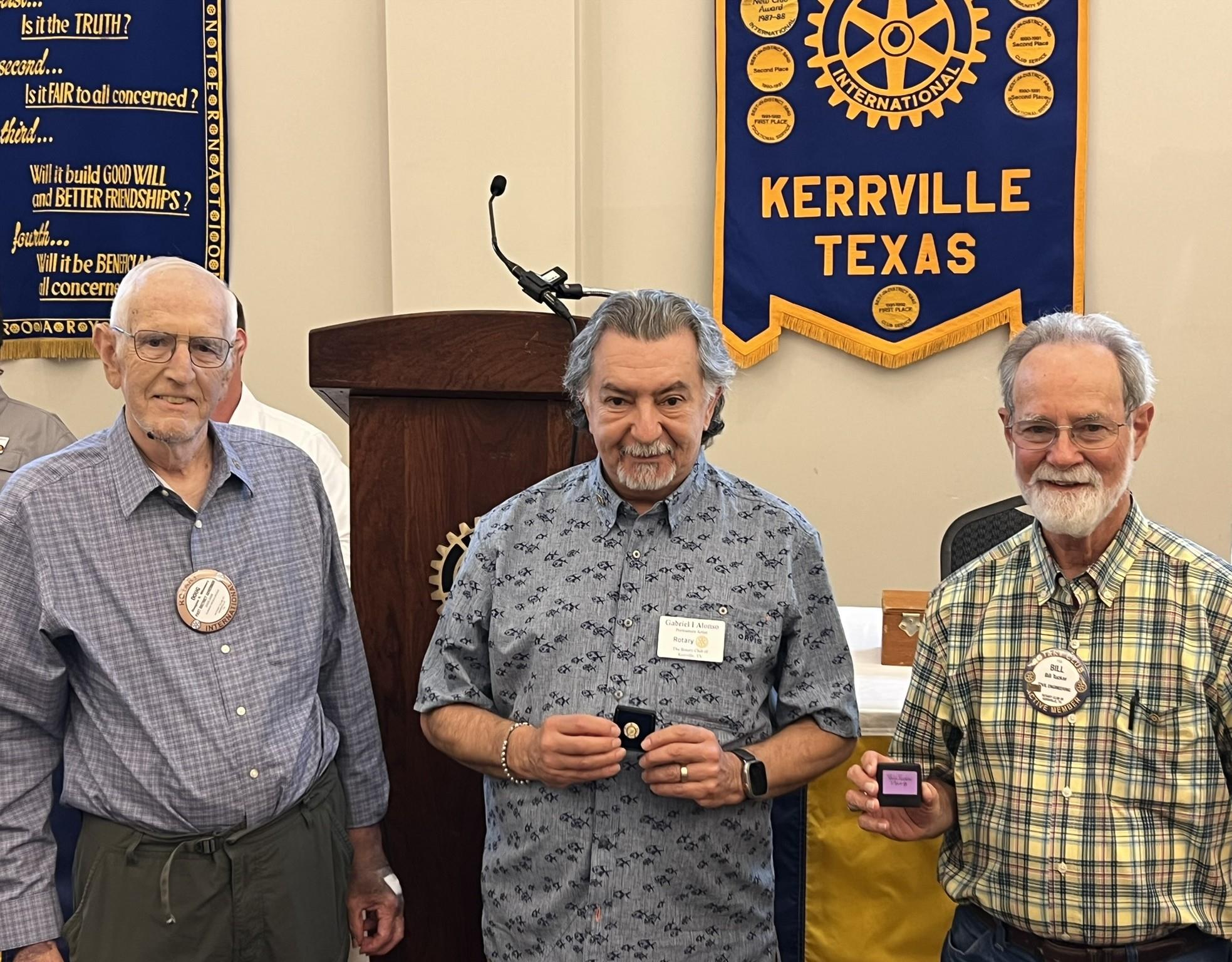 Paul Harris awardsTwo members received their Paul Harris awards recently, awarded by past club and District president Doug Whinnery. Gabriel Alonso received his PH+5 and Bill Tucker received his PH+8. Paul Harris Fellow (PHF) recognition is given in appreciation to anyone who contributes a gift of $1,000 or more to the Annual Programs Fund, PolioPlus or Humanitarian Grant programs that sustain and advance The Rotary Foundation’s humanitarian, educational and cultural programs.