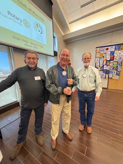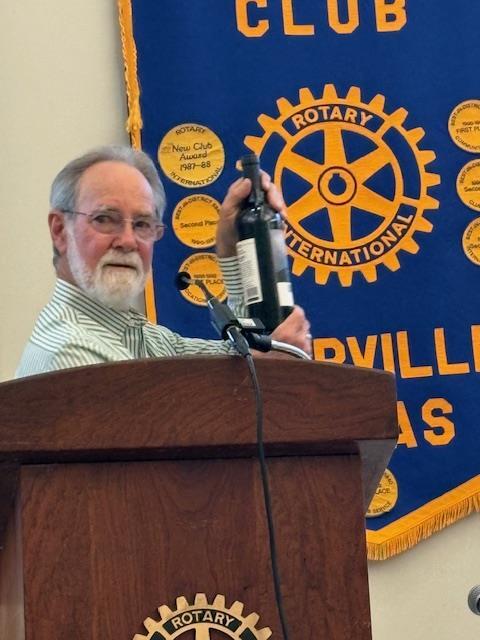 Wine is FineBob Schmerbeck was wearing his Rotary pin when his name was called, so he won a bottle of wine. Woody Lockhart and Bill Tucker of the Wine Team presented the prize.