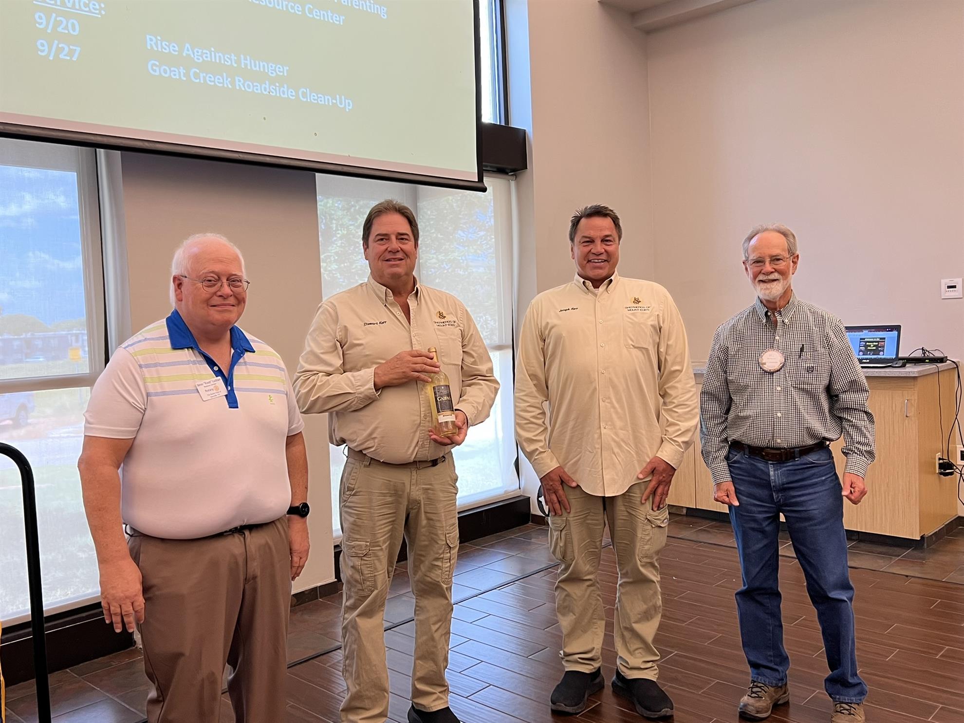 Singing Waters VineyardsSinging Waters Vineyards in Comfort, Texas, is a small but very successful local winery that has racked up some prestigious awards recently. Co-owner Missy Ivankovich, and wine maker Pat Johnson teamed up to talk to our Rotary club about their business. Missy and her husband Andy were in the software business in San Antonio, and were ready for a change in 2018. They sold their business and wanted to move to the hill country for a simpler lifestyle to raise their four kids. While looking for property, they stumbled across 126 acres for sale that had a winery on it. They decided to buy it, move there, and try to improve on the wine produced. They had no experience in wine making other than enjoying an occassional glass. They found Pat Johnson, an accomplished wine maker, who agreed to join them, and together they began work on making their new venture successful. They won several awards along the way as they developed their wines, and they were recently rewarded with a best in class award for their cabernet sauvignon ($90.00- $99.99) from the prestigious San Francisco Chronicle Wine Competition (2025). Missy and Pat generously donated a bottle of their best in class cabernet for our weekly wine give away. Leslie Rambin was wearing her pin when her name was called, and won the wine. She then asked Jeff Talarico to auction it off to our club, and Amber Thomason provided the winning bid of $500.00 that benefitted our club. Woody Lockhart, Amber Thomason and Bill Tucker. Missy Ivankovich, Amber Thomason, Pat Johnson and Leslie Rambin. Singing Water Vineyards is located in Comfort, and is open Thursday through Sunday. Singing Water Vineyards